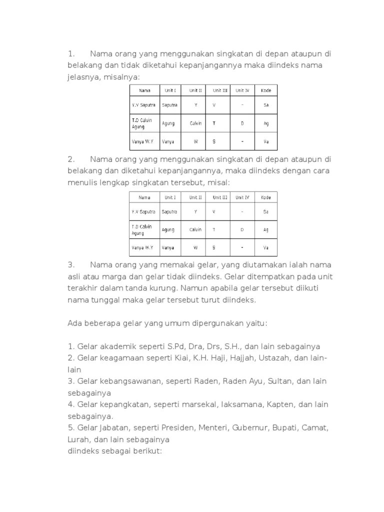 Berikut yang bukan merupakan bagian dari mengindeks nama dalam sistem abjad adalah. Nama perusahaan yang menggunakan nama orang, diindeks sebagaimana nama tersebut ditulis, kemudiaan diikuti dengan jenis . Mengindeks nama perusahaan (toko, pabrik, pt, firma, cv, . Mengindeks nama orang atau nama instansi dalam mengindeks nama orang perlu. Kode, awalan nama keluarga tersebut diabaikan.